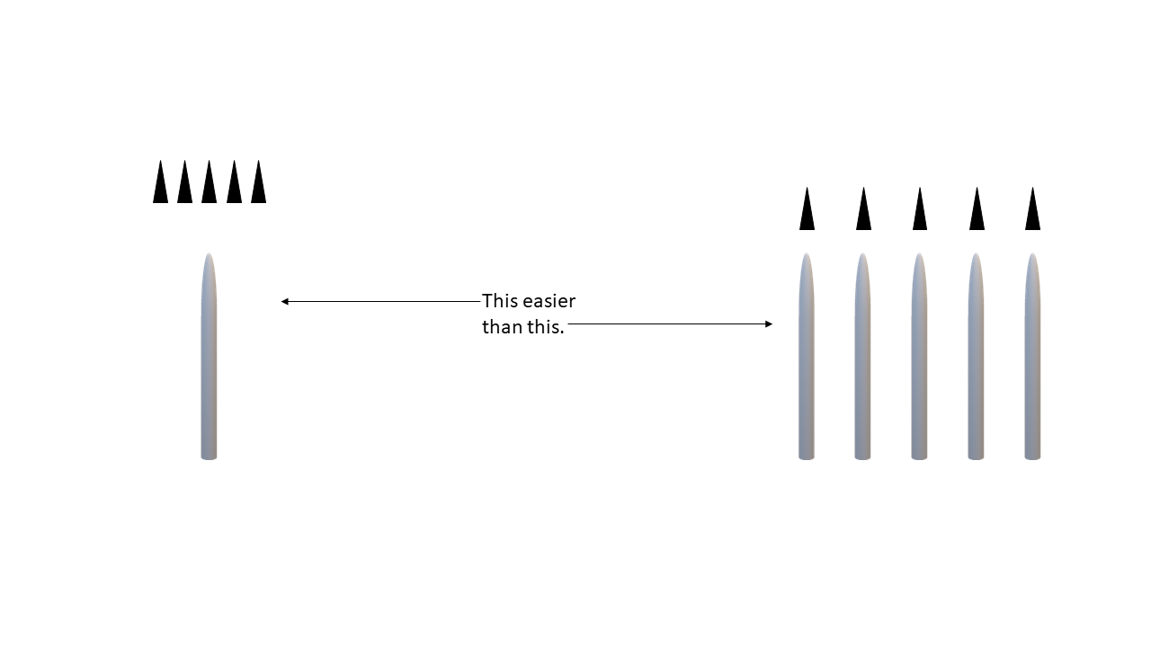 Next let’s consider if each missile is able to carry 5 objects, with one missile carrying 5 warheads without decoys, and 5 missiles carrying 1 warhead with 4 decoys each, however this is not necessarily accurate as decoys are usually smaller and lighter than warheads and therefore easier to carry on the bus.